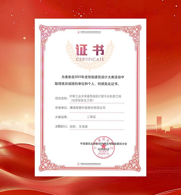 在2023年度智能建筑设计大赛活动中,由捷通承建的齐鲁工业大学通用超级计算平台机房工程(机房智能化工程),凭借创新的技术和优秀的设计与施工荣获大赛二等奖。